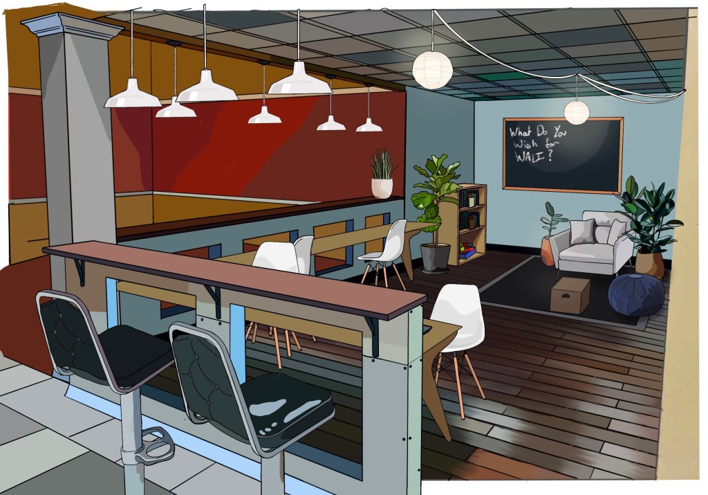 This is a visualization I made of the same space reworked based on a collaboration with Aaron Greiner, a representative of Culture House. We set aside the specifics of this community and focused on creating a space with three major goals/values:
