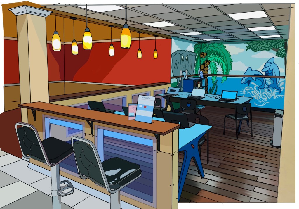 The first intervention had to do with treatments and lighting: turning off harsh fluorescents and replacing older fixtures to give a more inviting and soothing atmosphere, “less harsh, homier”. I replaced the murals, wall, and table colors with whites and grays, to reduce visual clutter. A carpet has been added for coziness and decoration. The plexiglass was removed from below the bar on either side for more openness and comfort. This also communicates that the space should protect you “not be protected from you”.